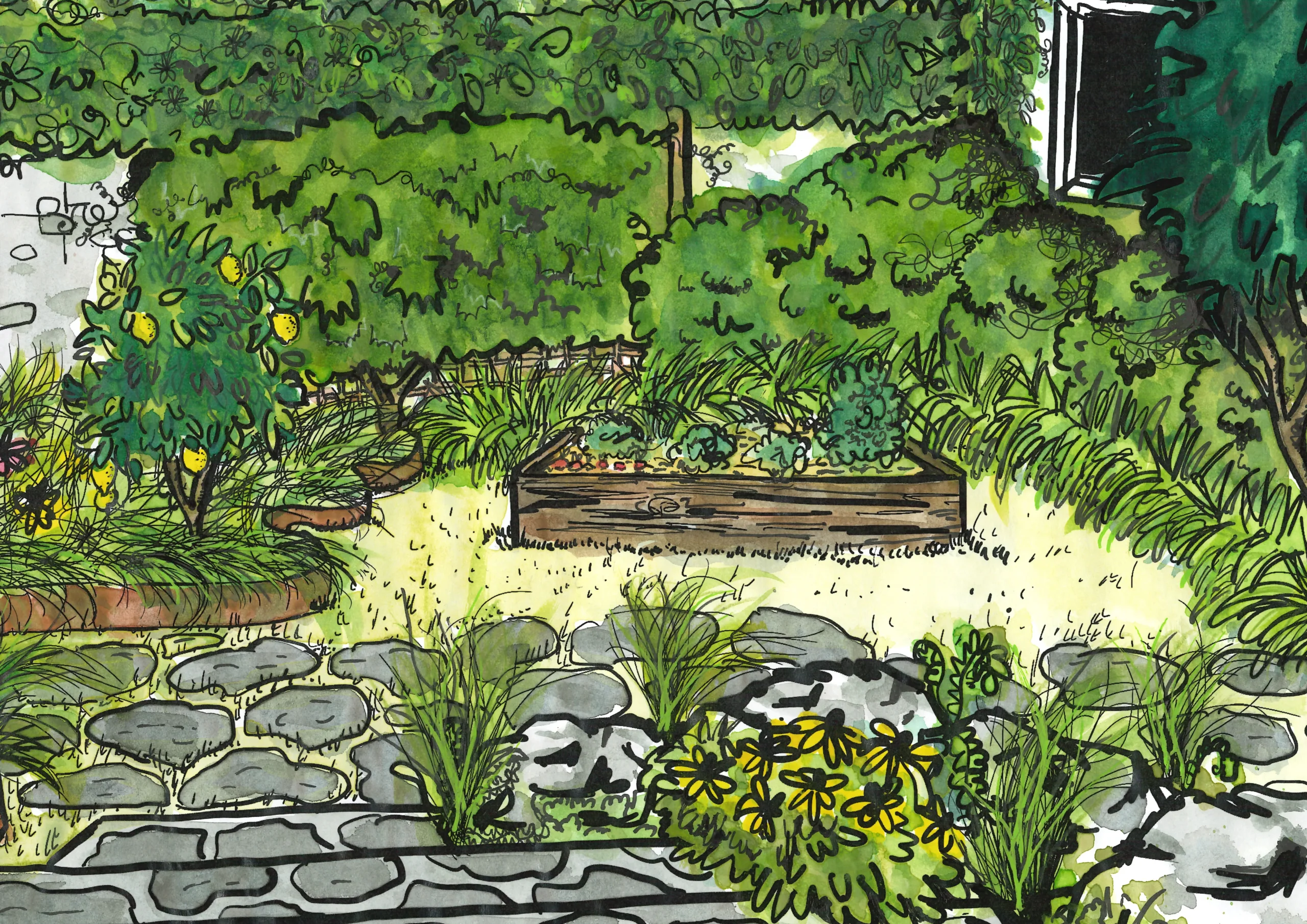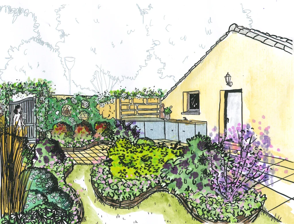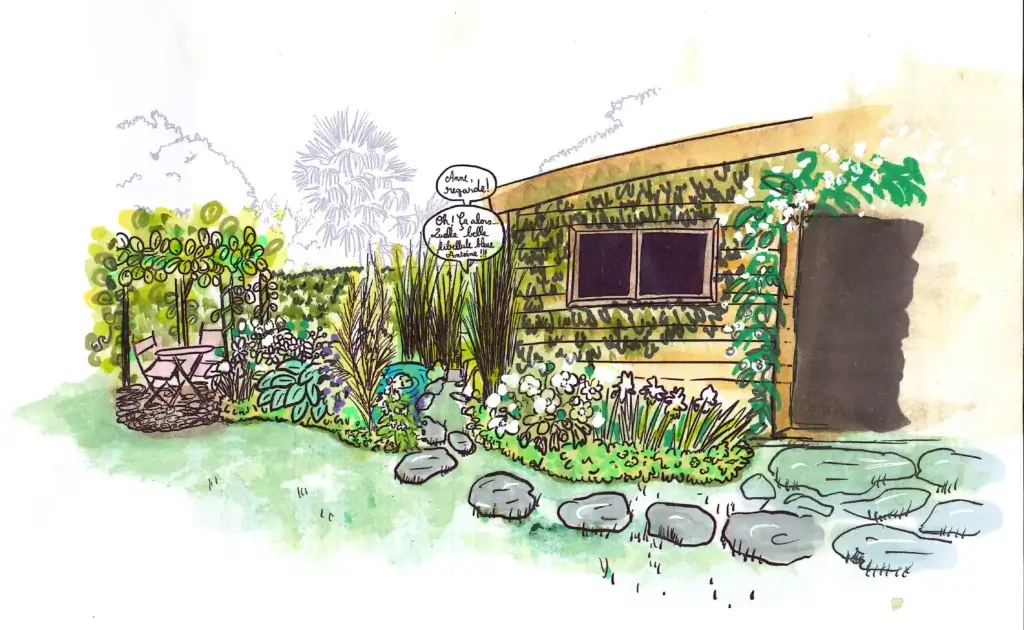 Nous redessinons – à la main & à l’aquarelle – votre jardin, façade végétalisé,